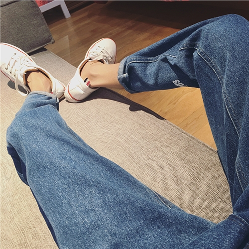 秋季新款港風文藝寬松休閑褲腿印花小腳男士牛仔褲
