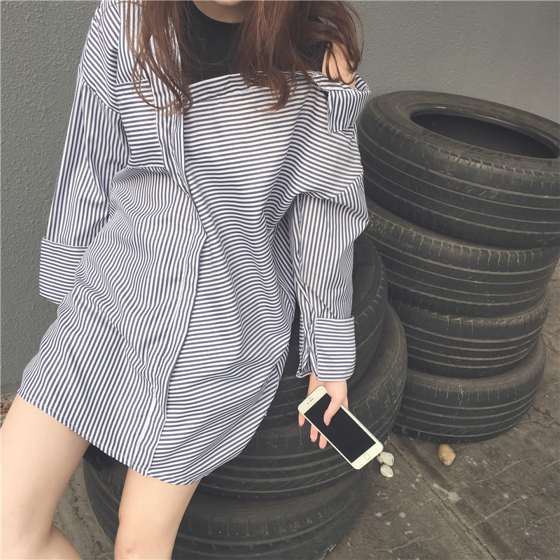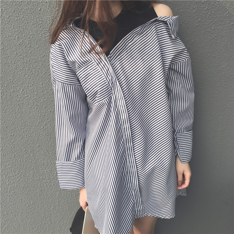條紋襯衫外套女2017秋裝新露肩上衣韓國藍白條紋襯衫中長款假兩件