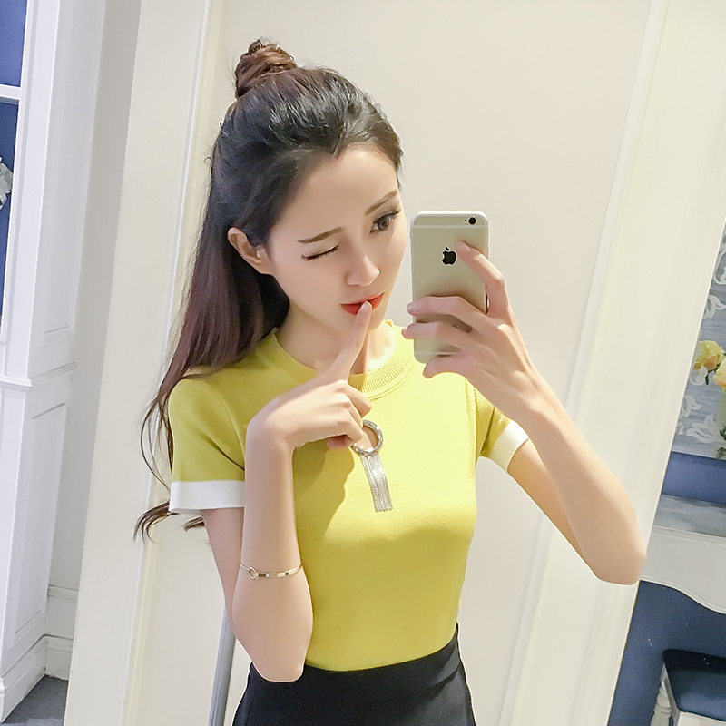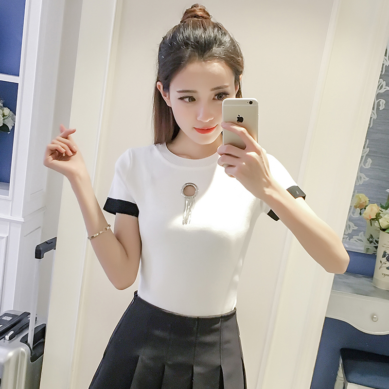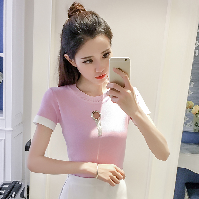 / 韓版女裝夏季新款圓領顯瘦上衣套頭百搭T恤女士短袖針織打底小衫