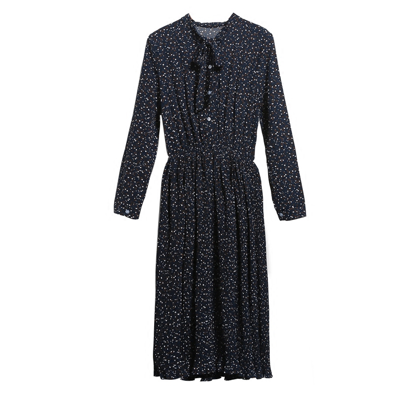 初春復古雪紡碎花長袖連衣裙韓版修身顯瘦半開領長款百褶裙女