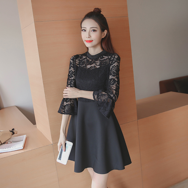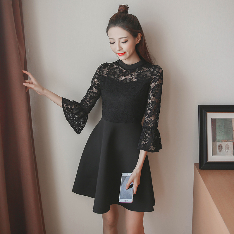 / 春秋裝新款女裝韓版高腰打底小黑裙修身顯瘦七分袖蕾絲連衣裙