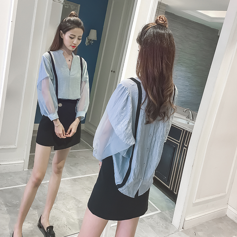 / 春季新款女裝V領襯衫女韓范七分袖拼接學生襯衣百搭寬松上衣