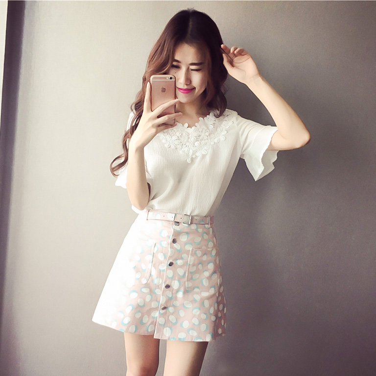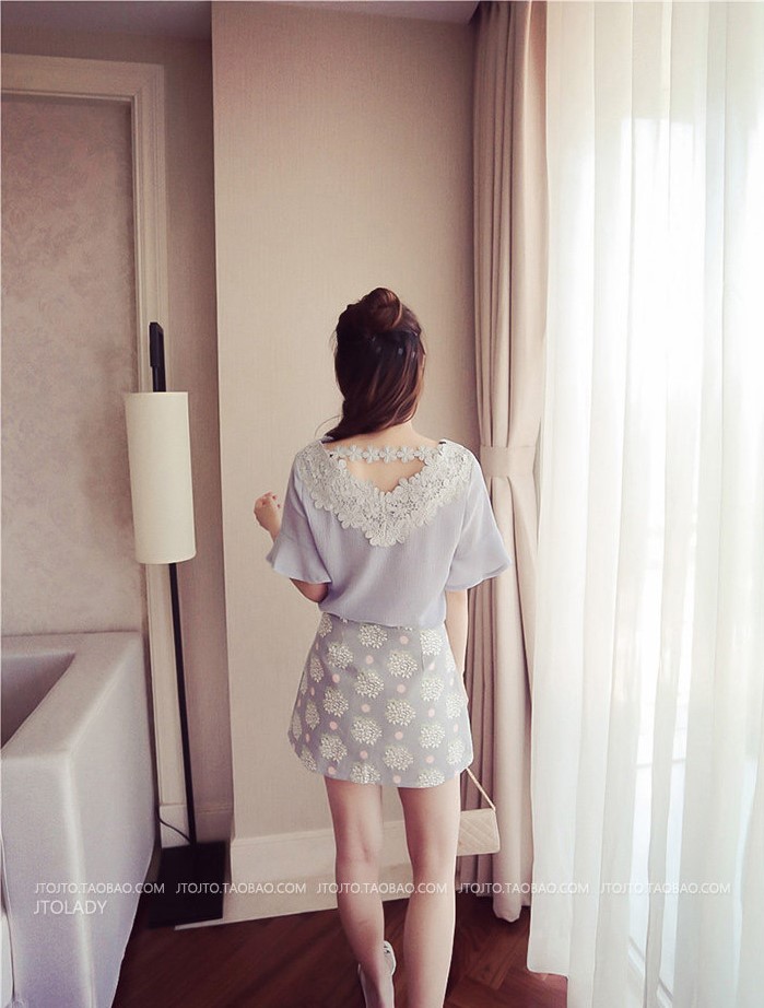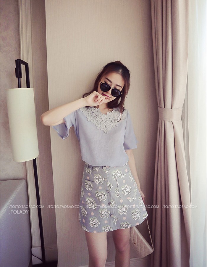 夏季新款V領荷葉邊喇叭袖雪紡衫女寬松顯瘦花朵短袖蕾絲鏤空上衣