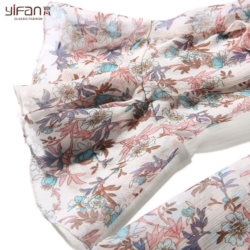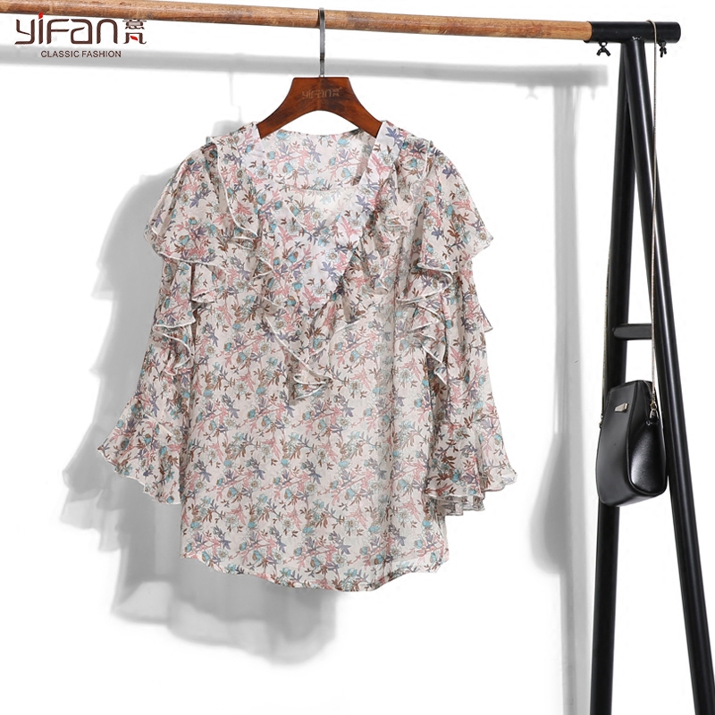 / 夏季韓版V領喇叭袖碎花套頭雪紡衫女荷葉邊打底上衣七分袖薄