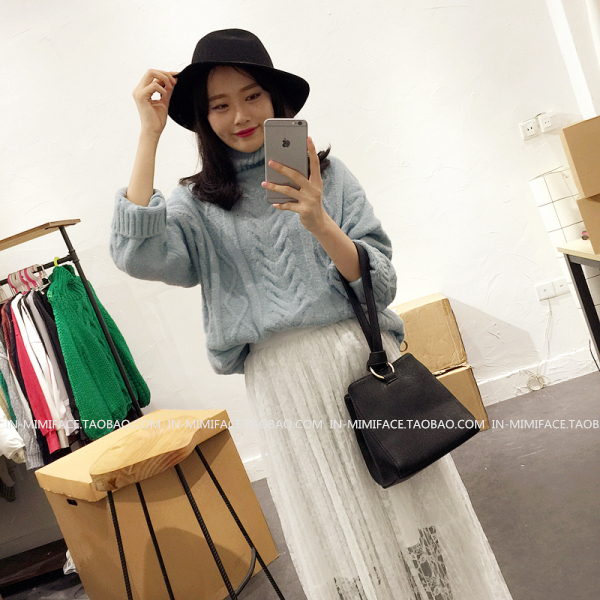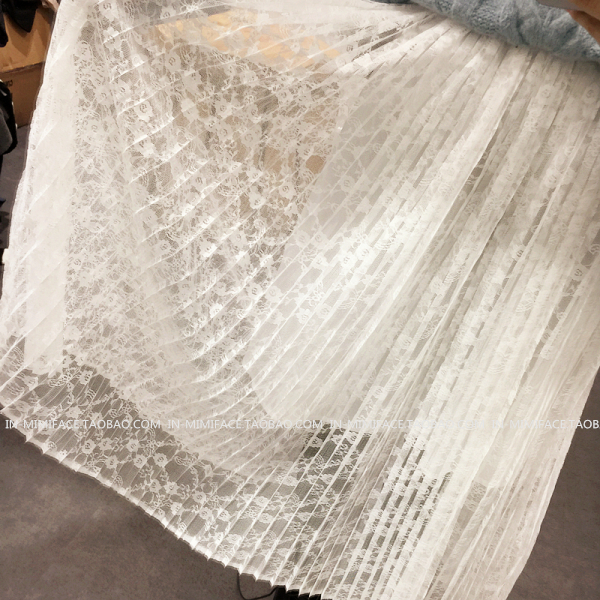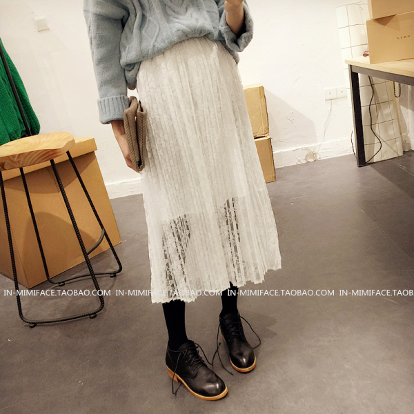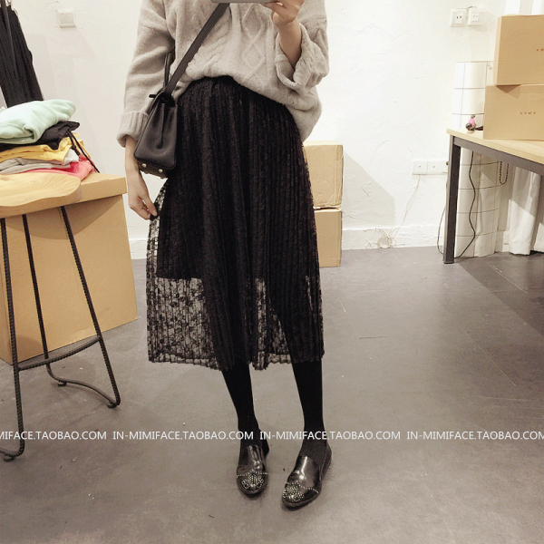 春秋冬裝新款寬松顯瘦蕾絲拼接網紗半身裙韓版氣質百褶中長裙子潮
