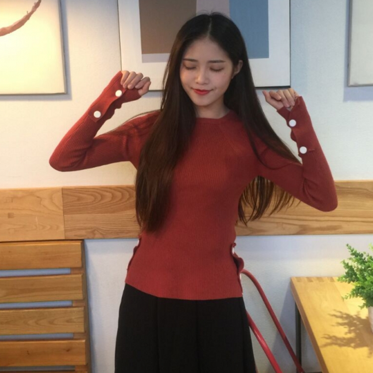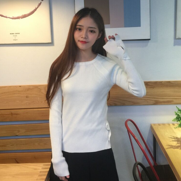 韓國秋冬款時尚百搭純色紐扣套頭修身顯瘦螺紋打底衫針織衫女