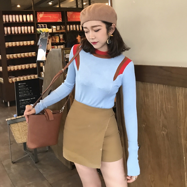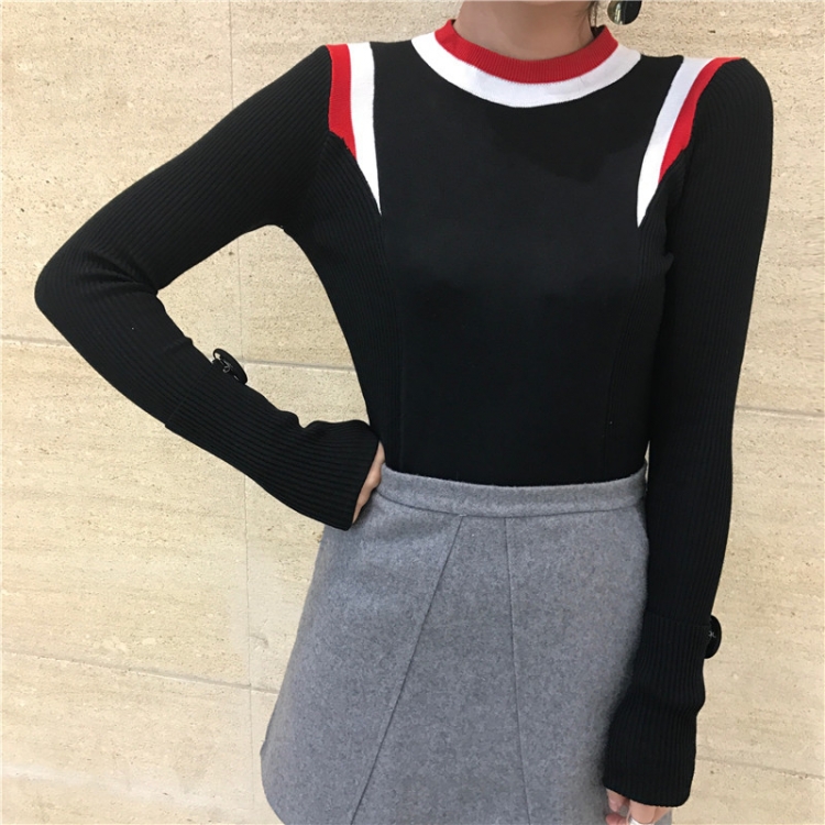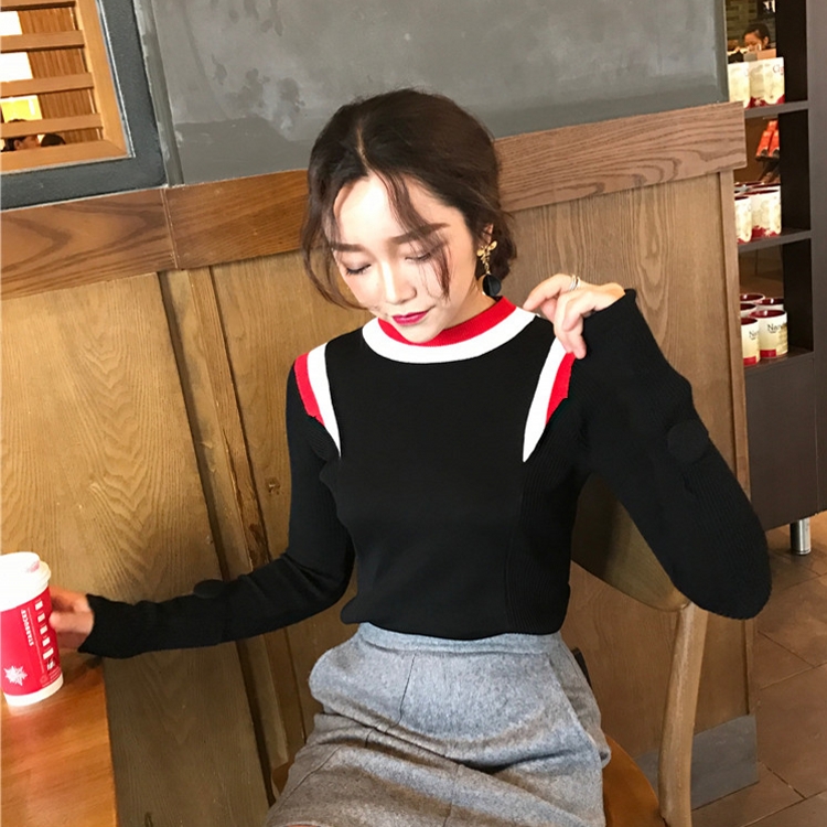 韓國chic秋冬款時尚拼色螺紋紐扣修身套頭長袖打底衫針織衫女