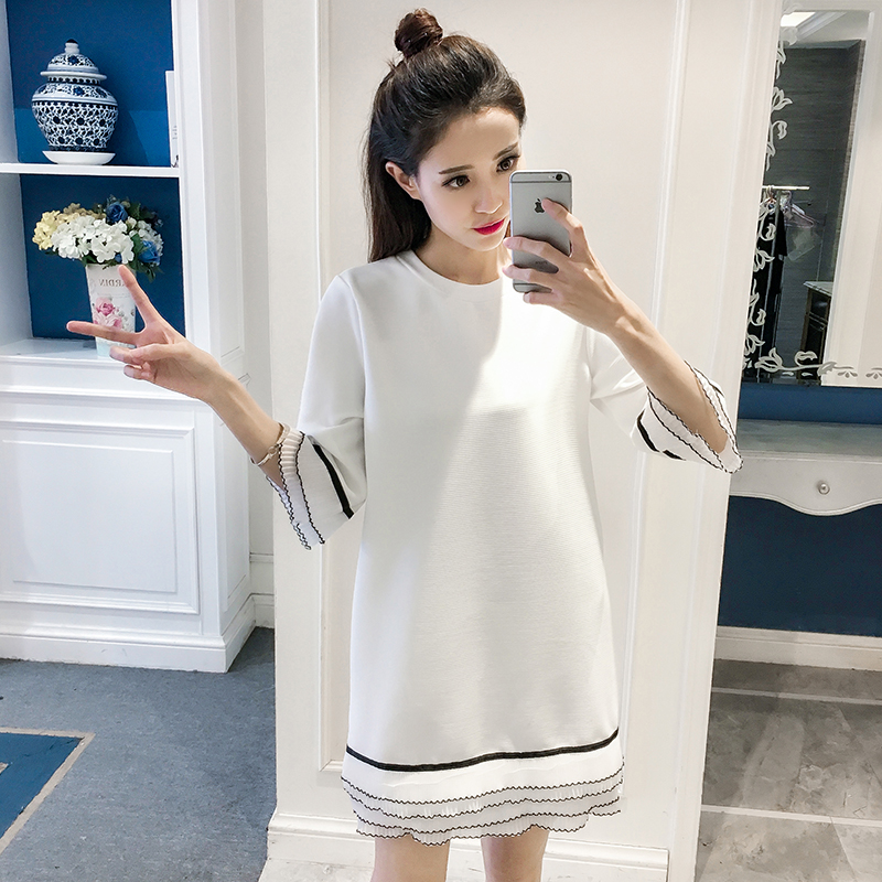 / 春夏新款女裝韓版條紋拼接打底裙中長款寬松顯瘦五分袖連衣裙