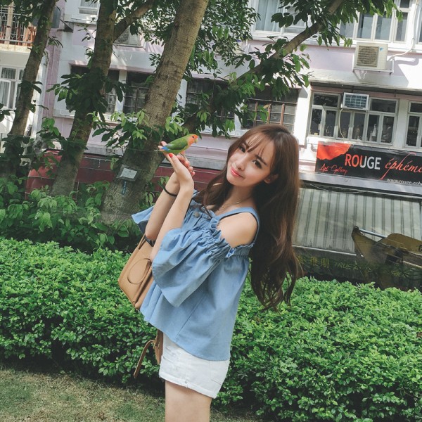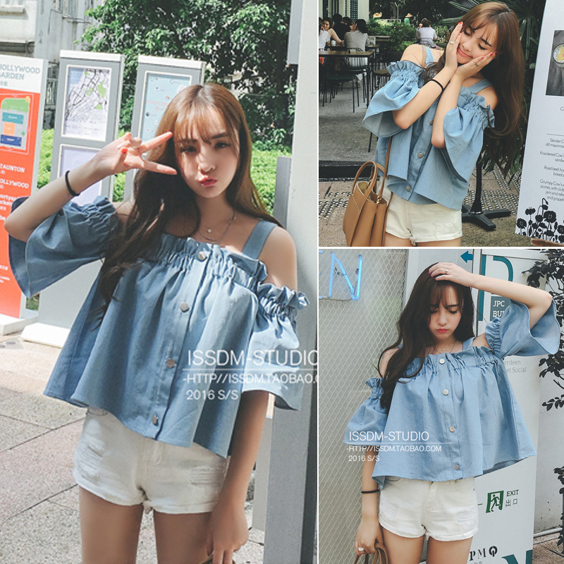 / 女款上衣春季2017新款漏肩襯衫漏肩一直領露肩韓版一字肩百搭個性
