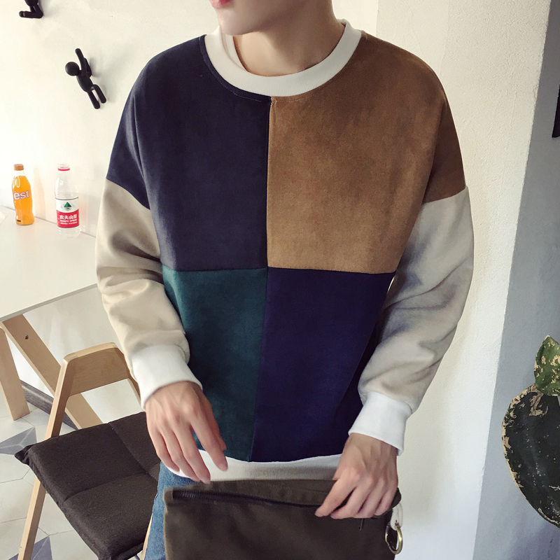 港風男裝麂皮絨韓版休閑拼接圓領青年套頭男士衛衣