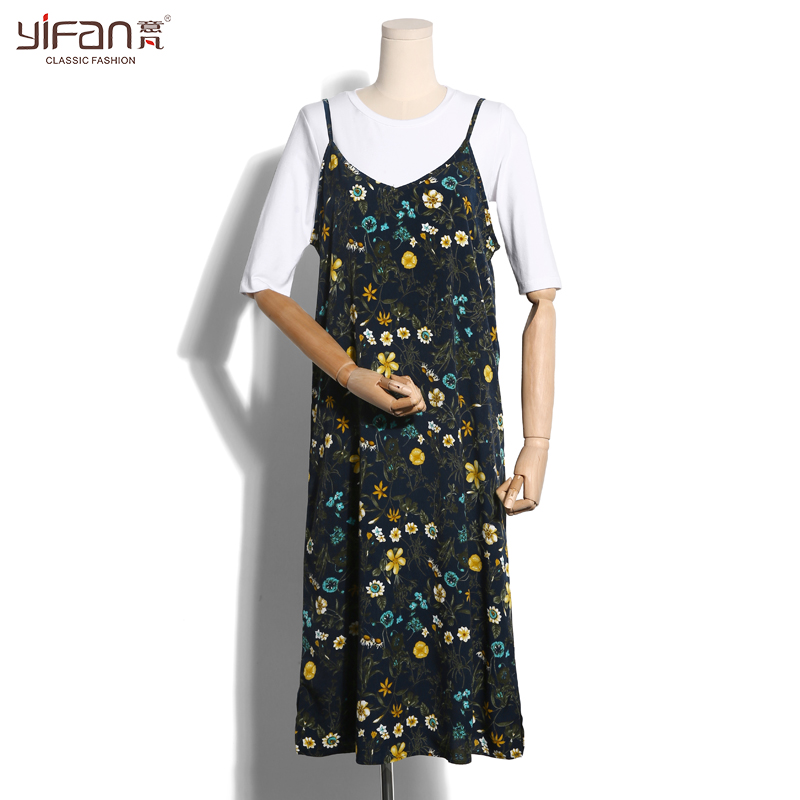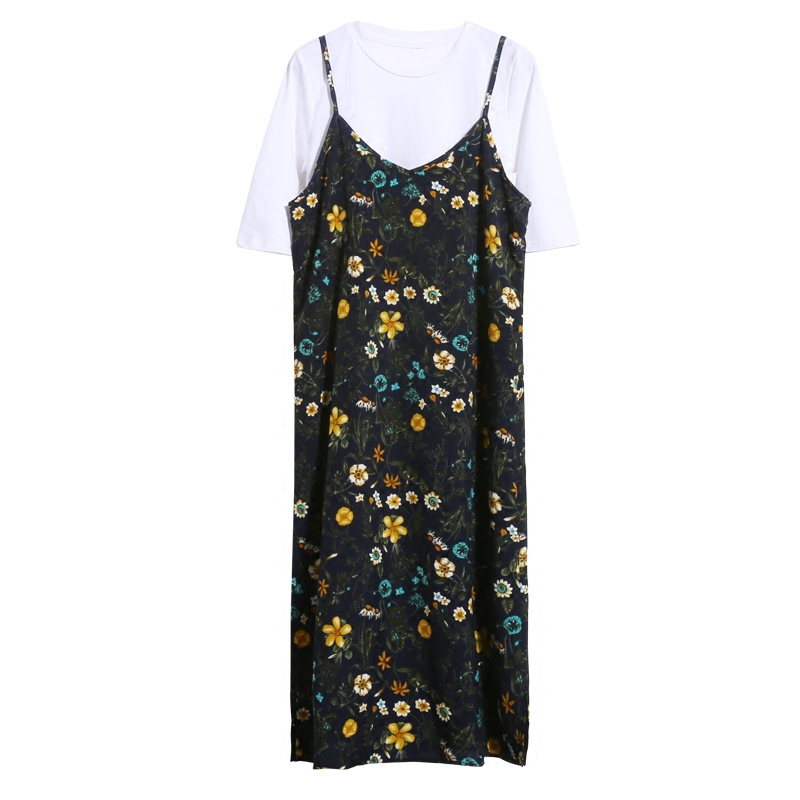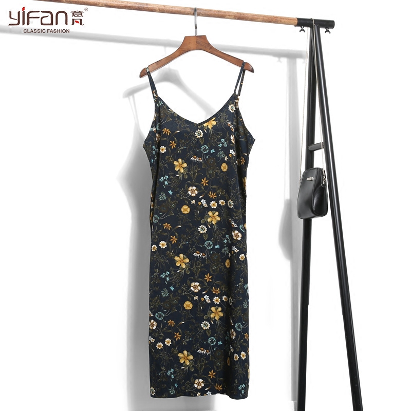 / 春夏韓版雪紡吊帶裙女碎花長裙寬松v領復古顯瘦中長款打底連衣裙
