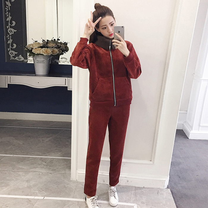 秋冬新款韓版女裝加厚燈芯絨長袖外套+高腰休閑褲兩件套時尚套裝