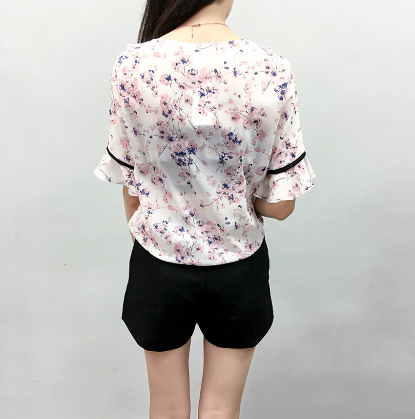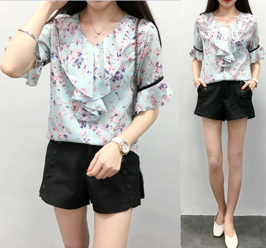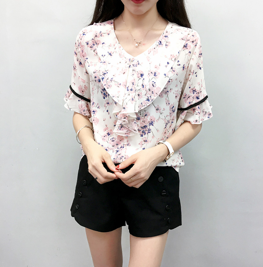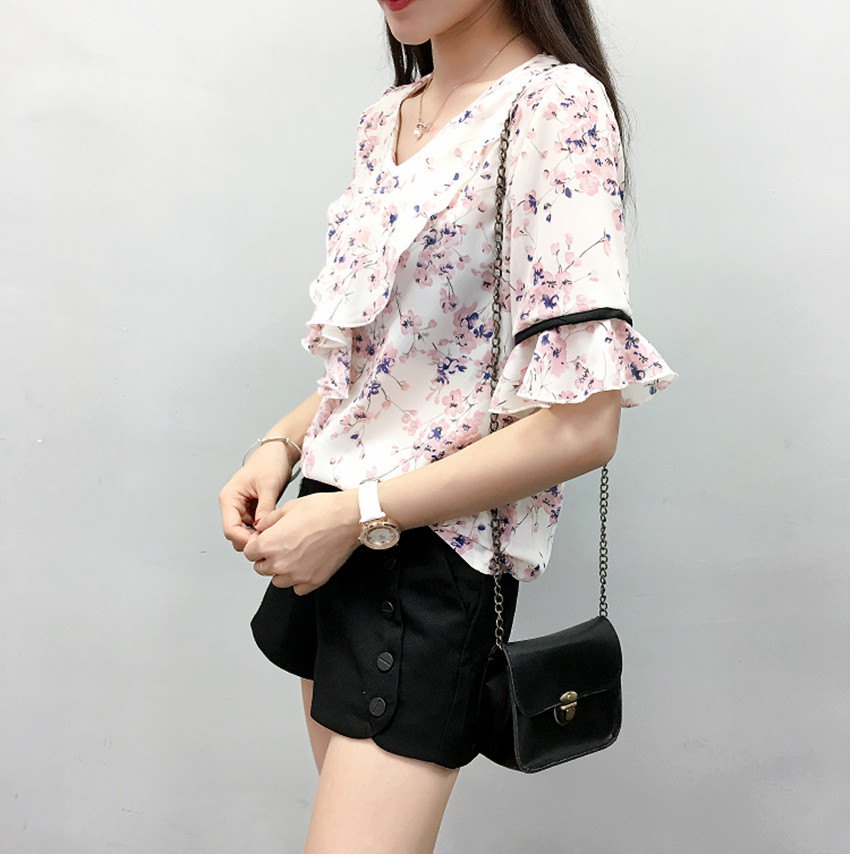 雪紡上衣女短袖夏裝2017新款氣質V領荷葉邊喇叭袖碎花雪紡衫小衫
