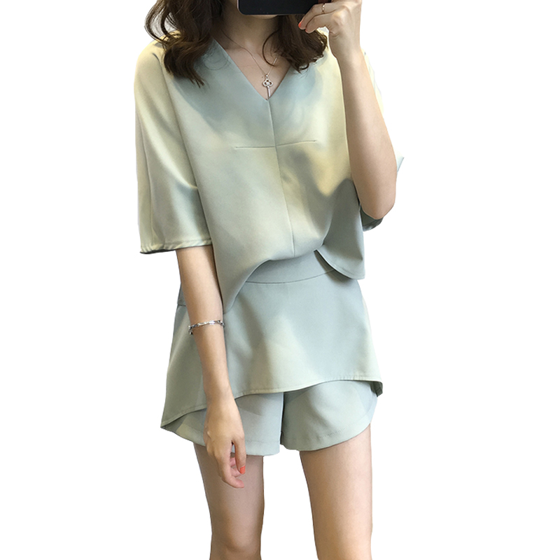 / 夏裝新款韓版女裝甜美V領短袖t恤上衣兩件套闊腿短褲時尚大碼套裝