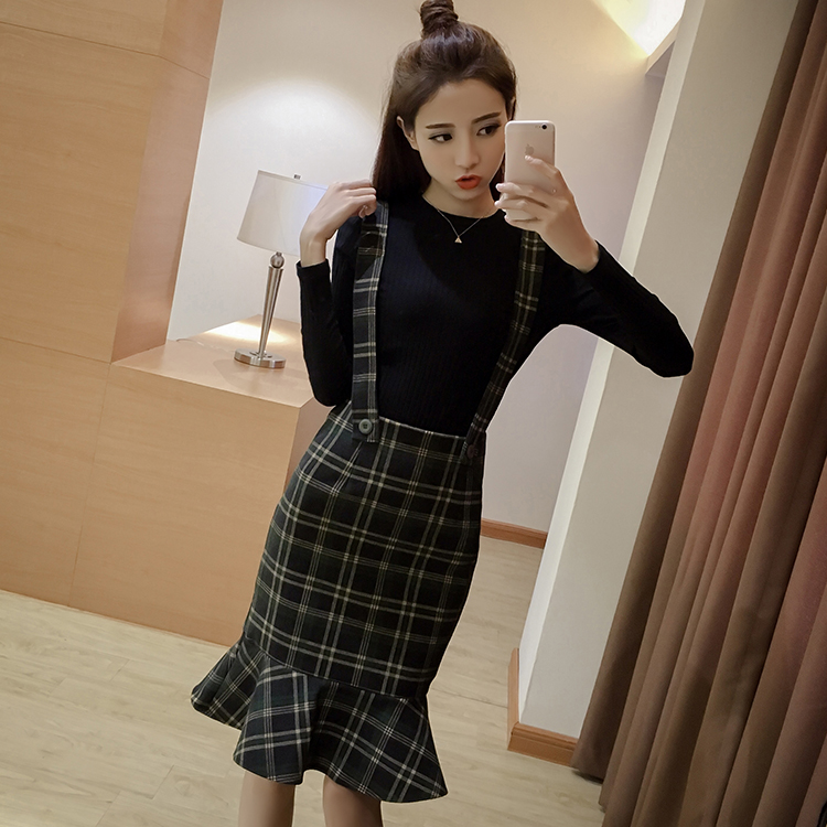 / 女裝秋冬季新款韓版背帶兩件套格子連衣裙修身包臀毛呢魚尾裙