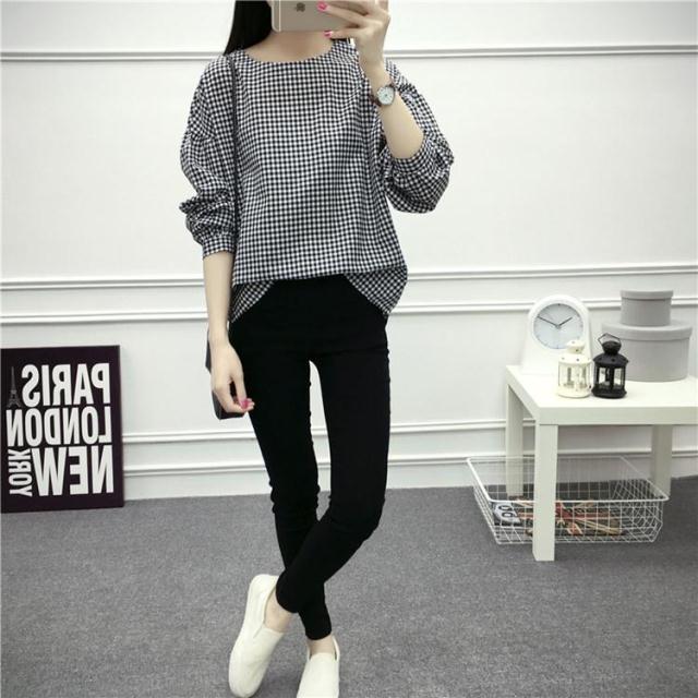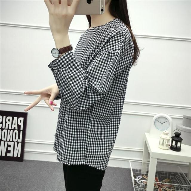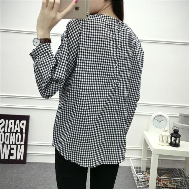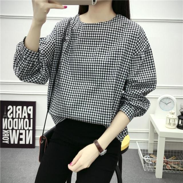 2017春秋新款韓版學院風長袖格子襯衫外套女上衣寬松棉麻襯衣學生