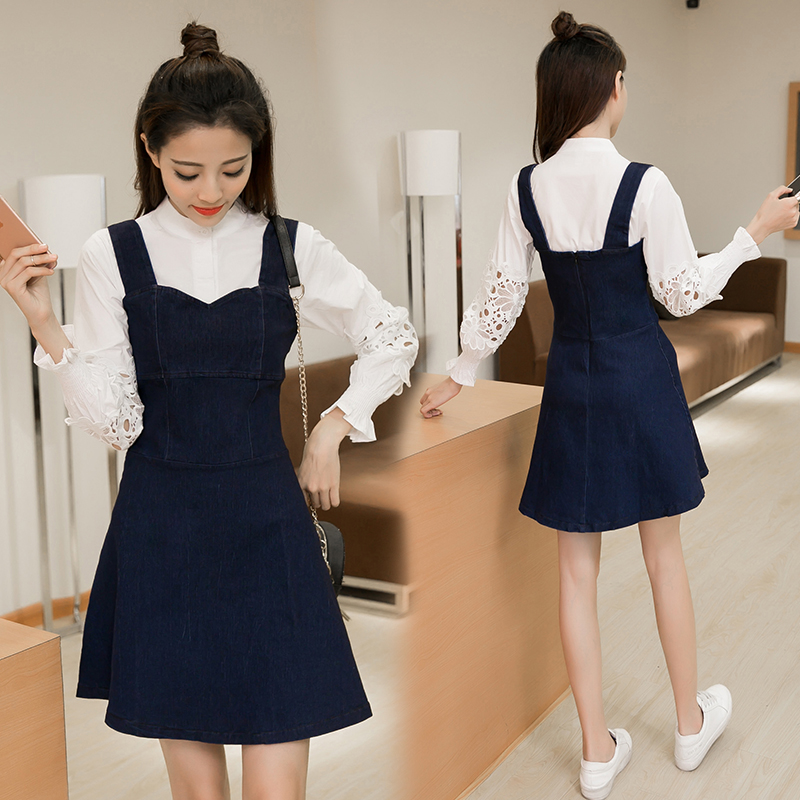 早春女裝韓版牛仔背帶裙兩件套修身顯瘦鏤空長袖連衣裙春秋