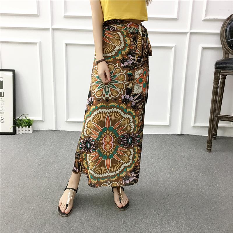 / 波西米亞一片式半身裙中長款系帶裙子雪紡沙灘裙碎花開叉長裙女夏