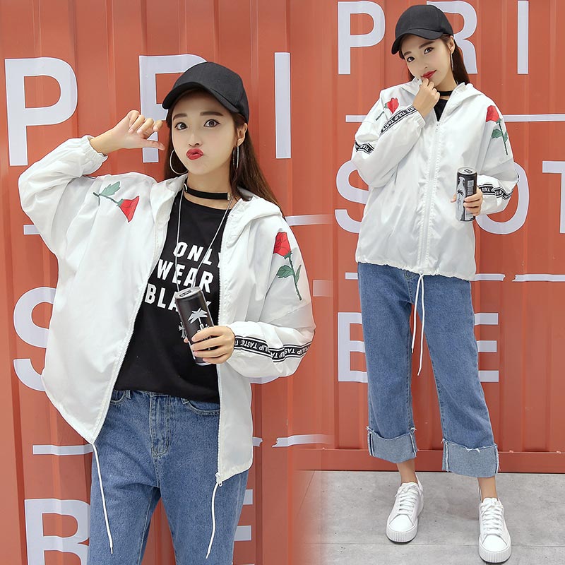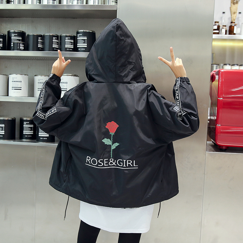 2017秋裝新款玫瑰印花寬松BF風連帽夾克外套百搭學生長袖棒球服女