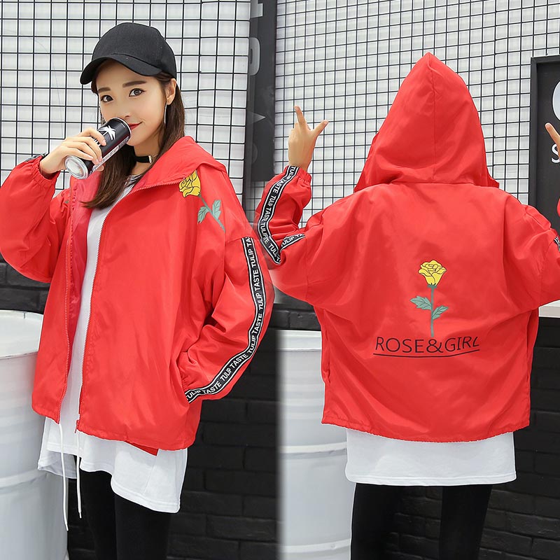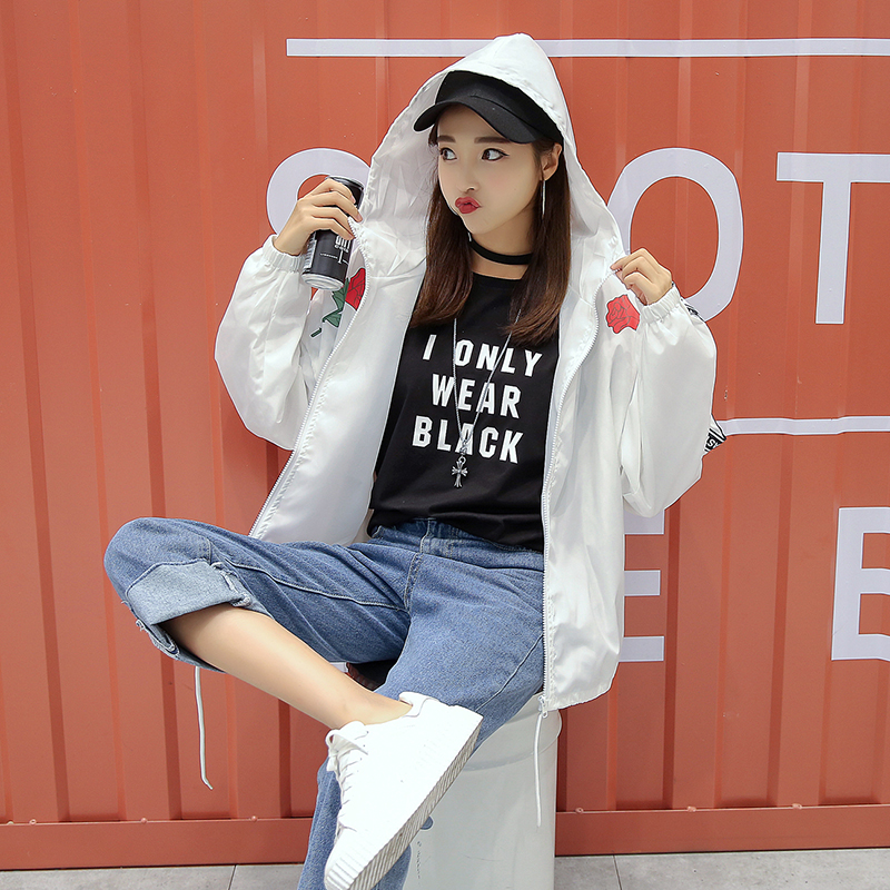 / 2017秋裝新款玫瑰印花寬松BF風連帽夾克外套百搭學生長袖棒球服女