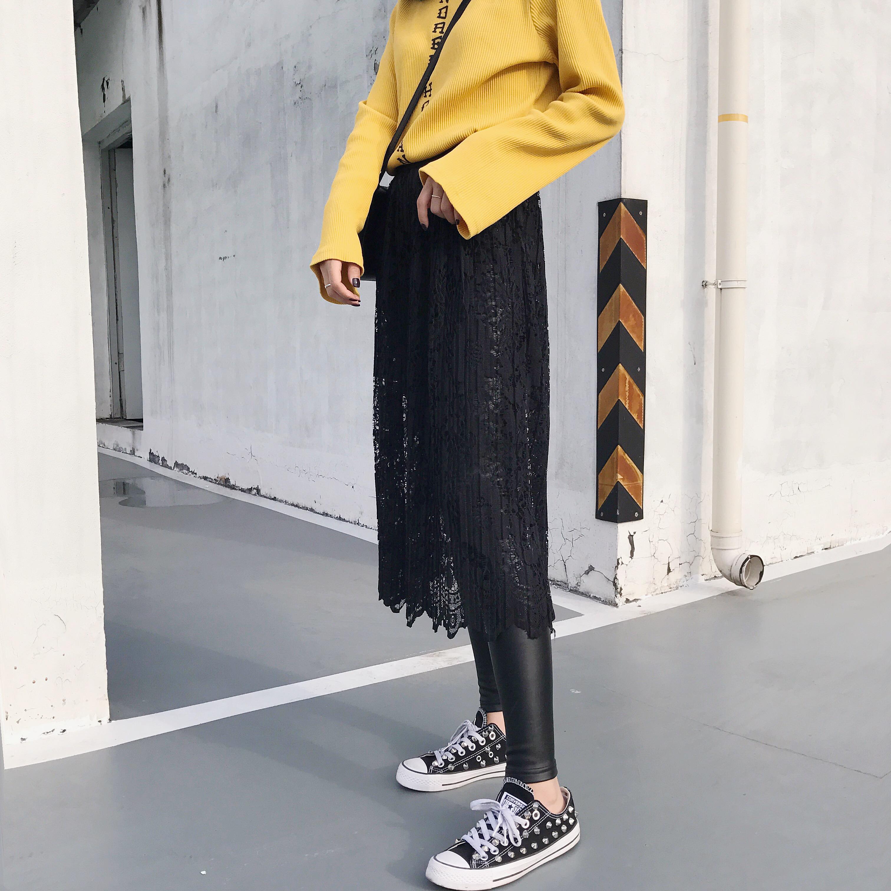 蕾絲拼接假兩件皮褲裙 腰圍是松緊腰圍 皮褲加絨