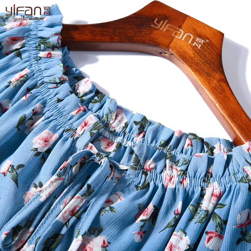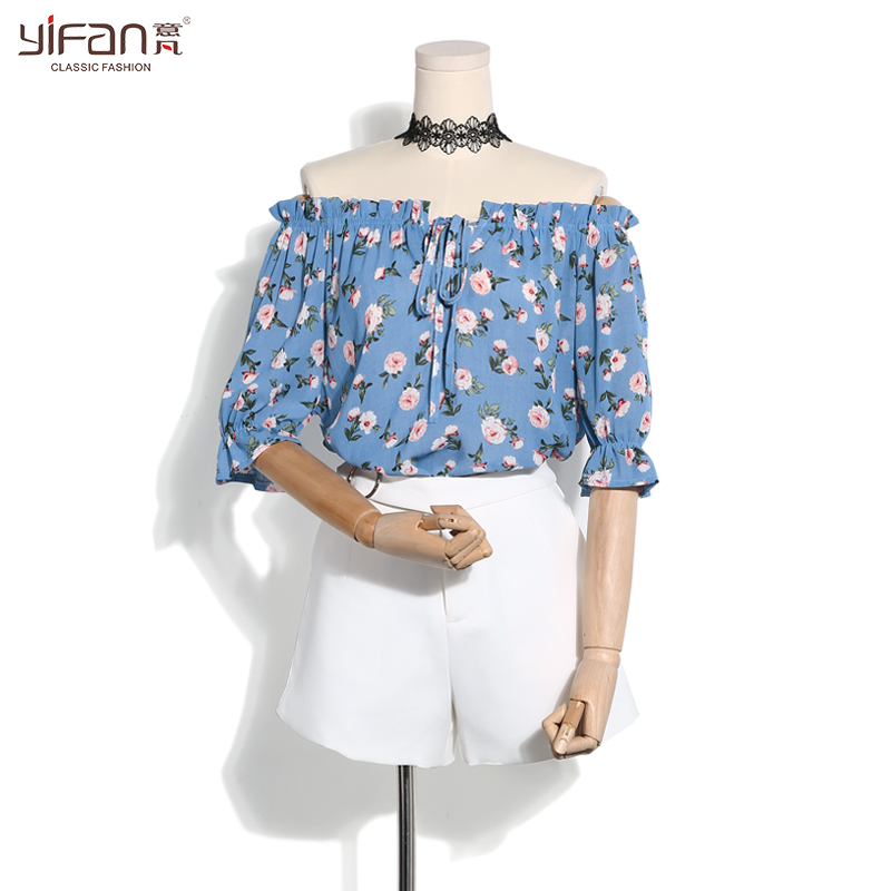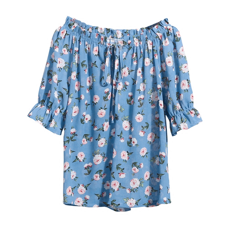 / 韓版甜美碎花喇叭袖寬松雪紡衫夏一字領露肩短袖娃娃衫印花上衣女