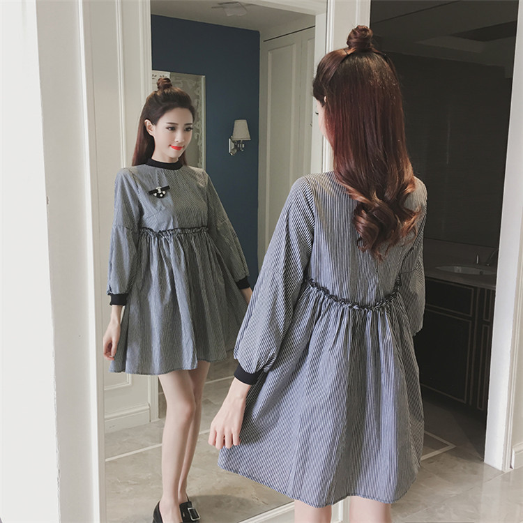 春裝新款女裝韓版寬松A字裙女顯瘦中長款條紋長袖連衣裙秋冬