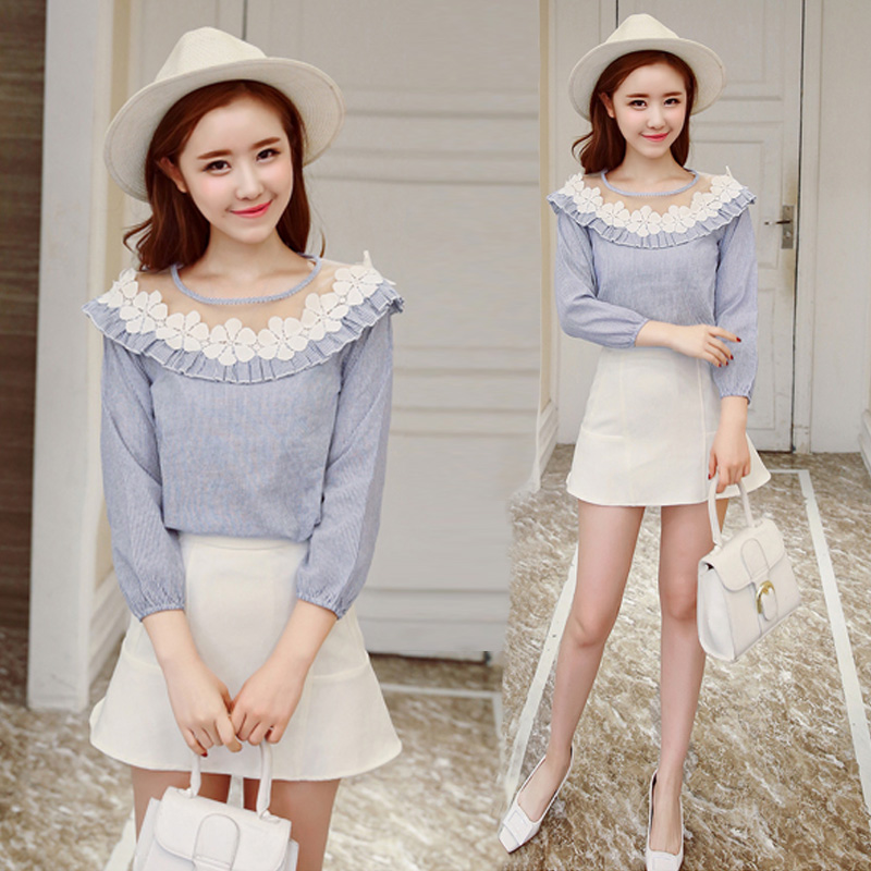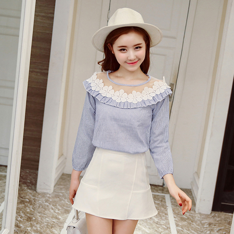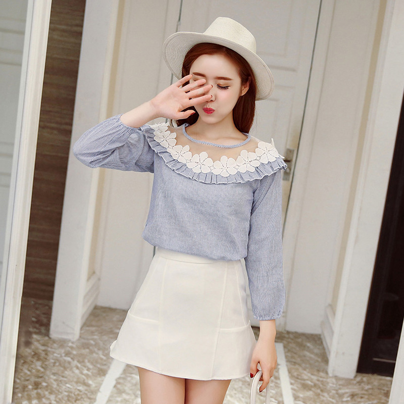 / 春季新款韓版甜美網紗蕾絲拼接條紋襯衫女寬松百搭長袖上衣潮