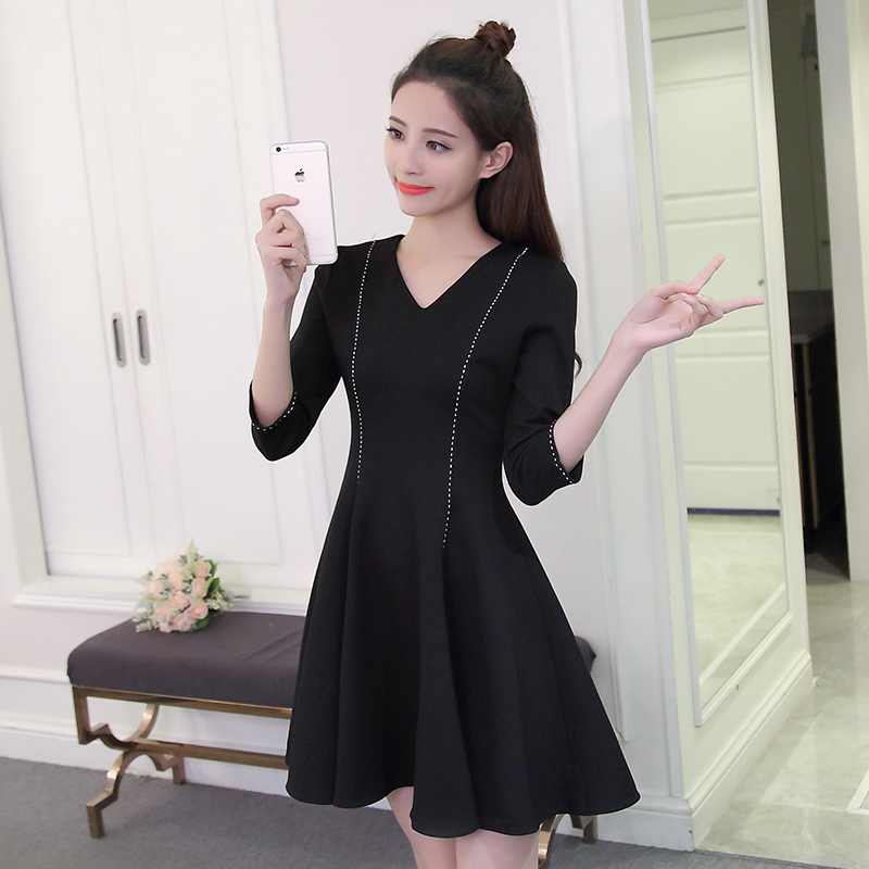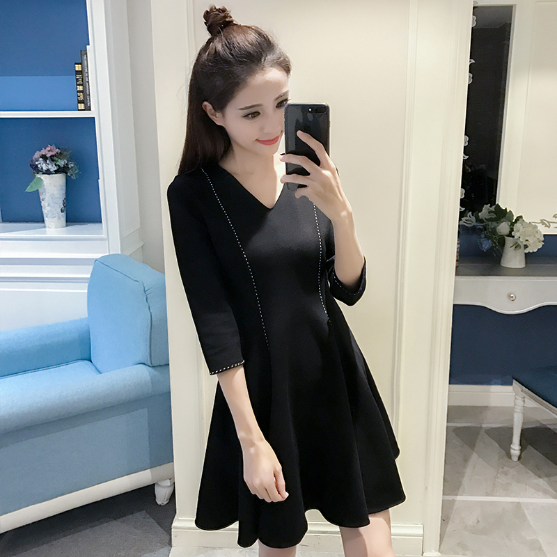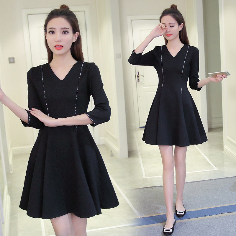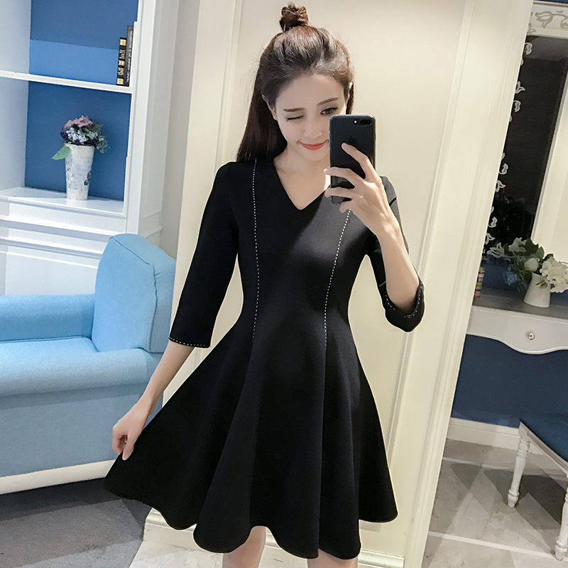 / 春裝新款女裝復古赫本小黑裙高腰顯瘦V領長袖蓬蓬打底連衣裙