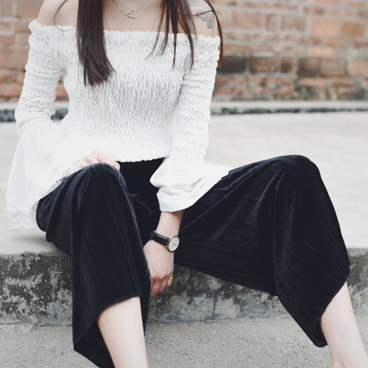 春夏女裝2017新款韓版百褶絲絨松緊腰闊腿褲九分寬松休閑褲直筒褲