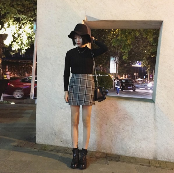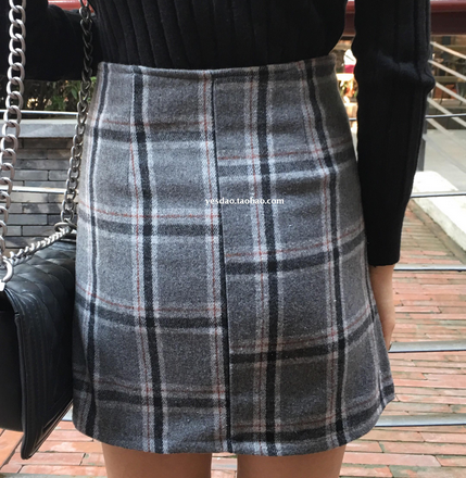 美亦隨興春秋新款 韓版復古大格子高腰顯瘦薄呢子A字短裙半身裙女