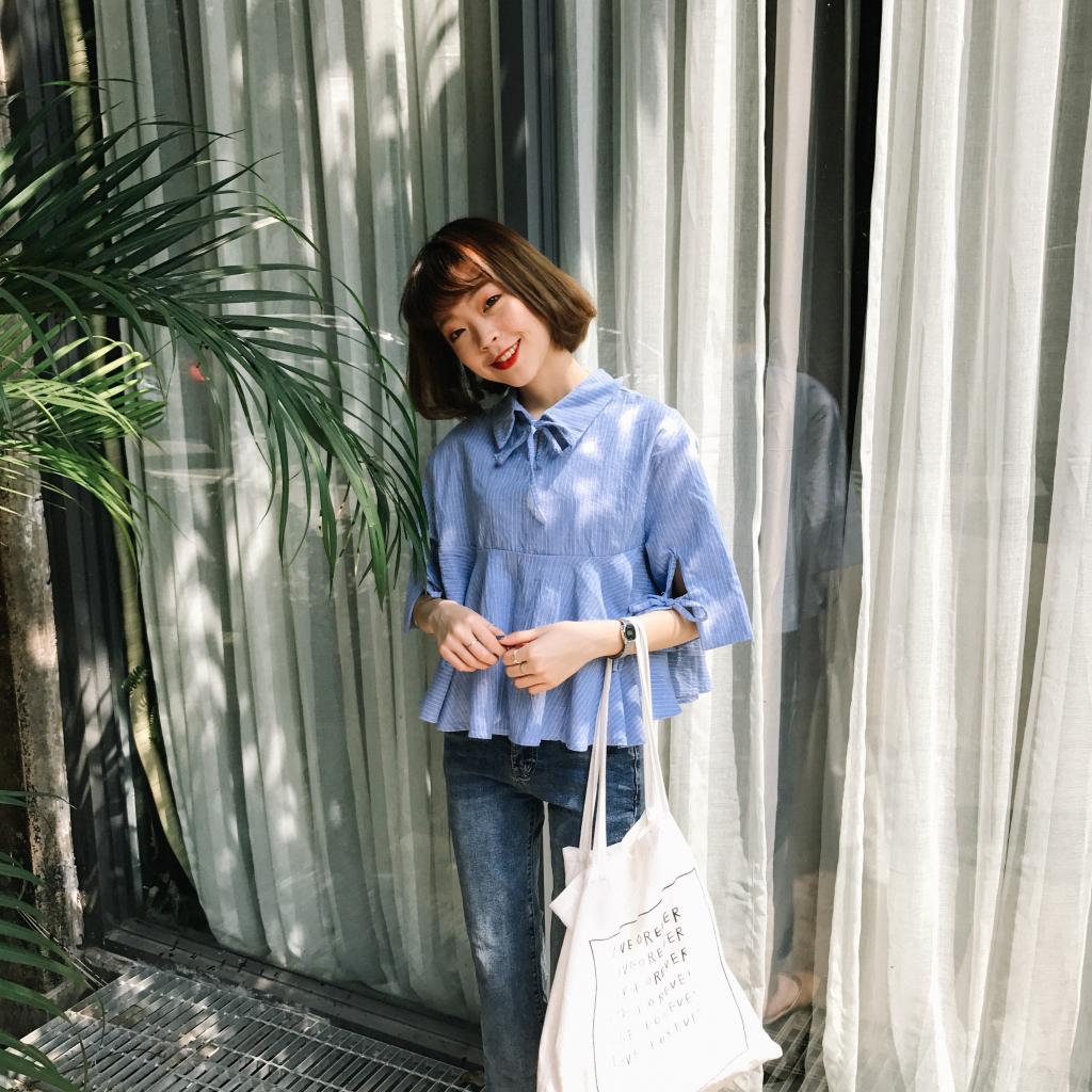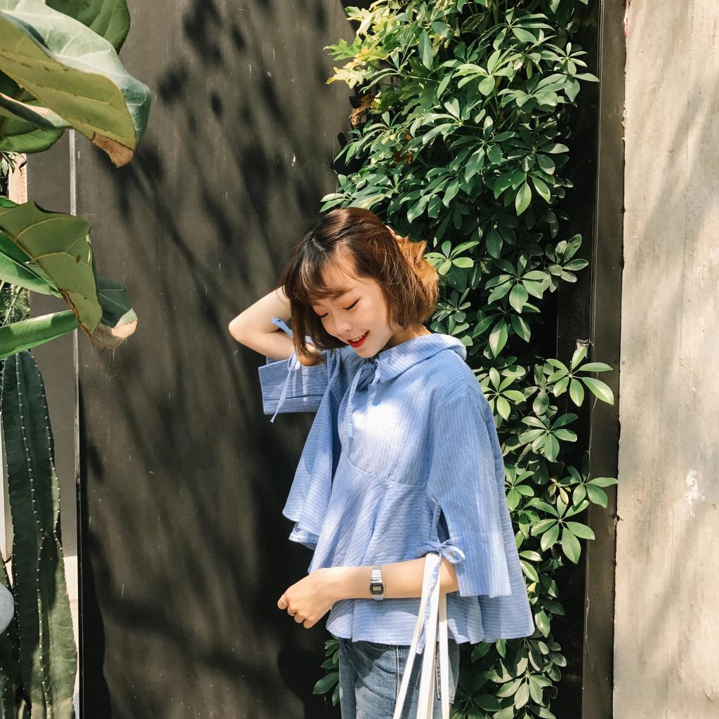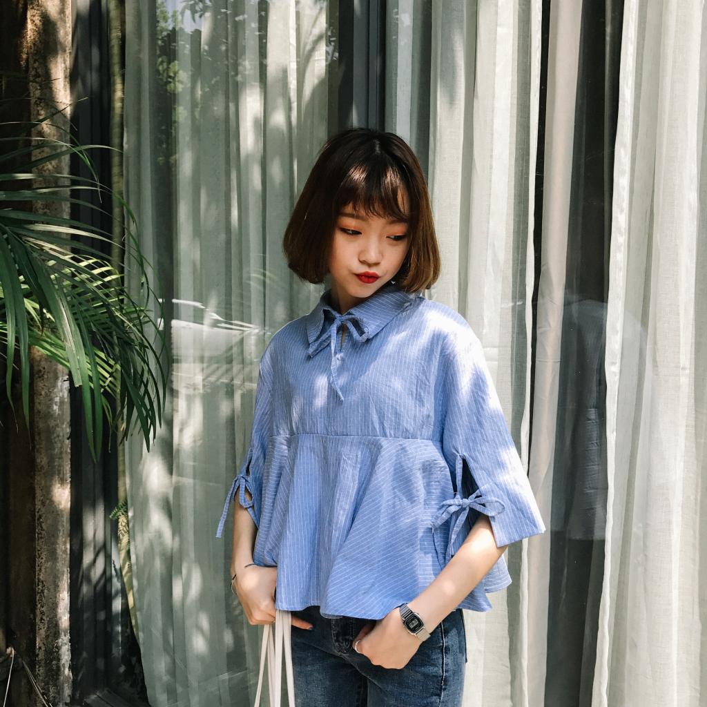 / 夏季韓范豎條圓領套頭甜美落肩喇叭袖娃娃衫收腰修身顯瘦上衣女
