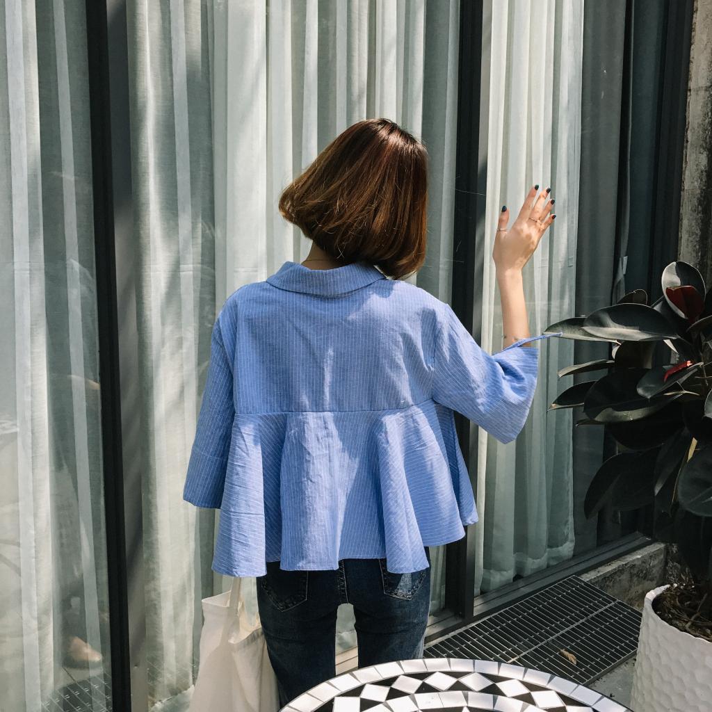 夏季韓范豎條圓領套頭甜美落肩喇叭袖娃娃衫收腰修身顯瘦上衣女