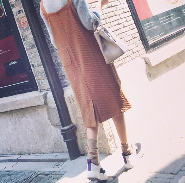 韓版2017春季新品寬松中長款大口袋后開叉螺紋厚實背帶裙連衣裙子