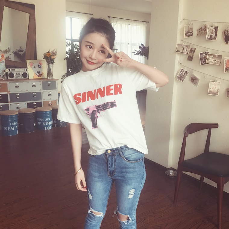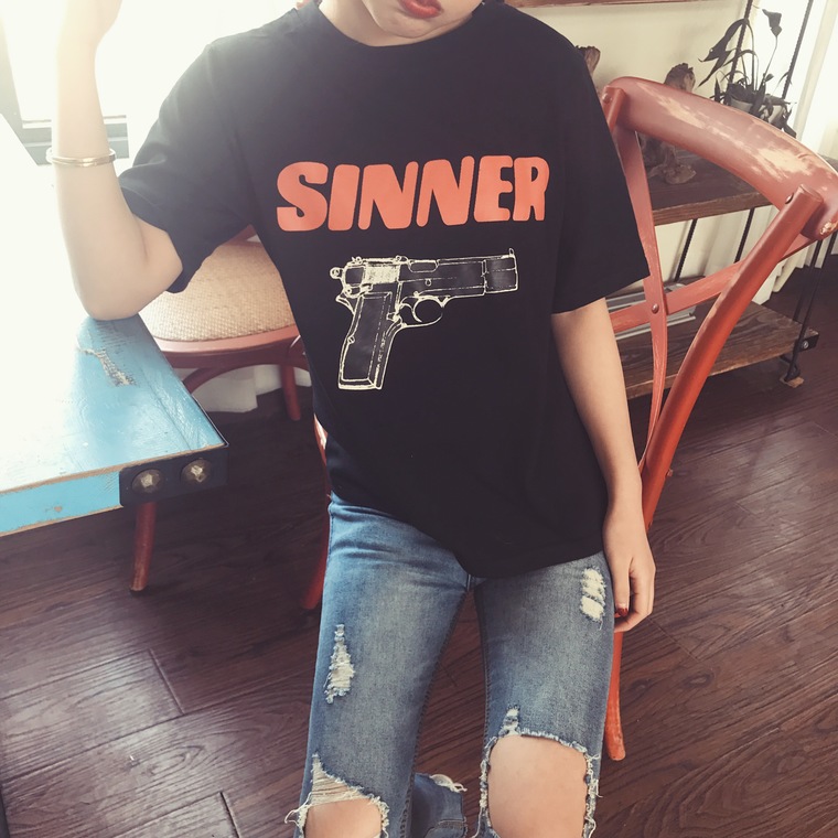 / 2017春夏新品學院風寬松百搭字母手槍印花圓領套頭短袖T恤