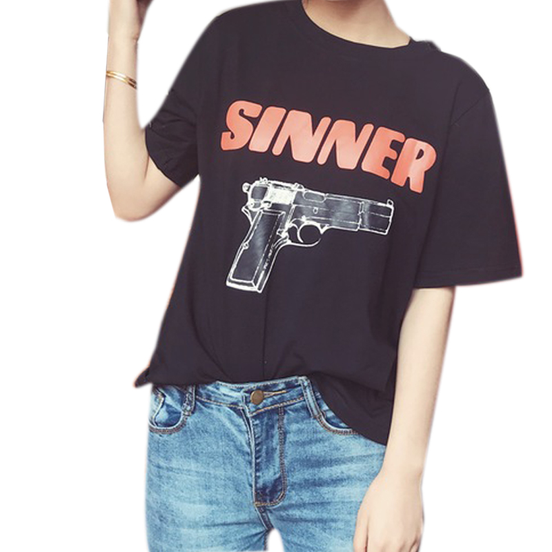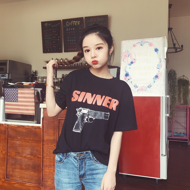 2017春夏新品學院風寬松百搭字母手槍印花圓領套頭短袖T恤
