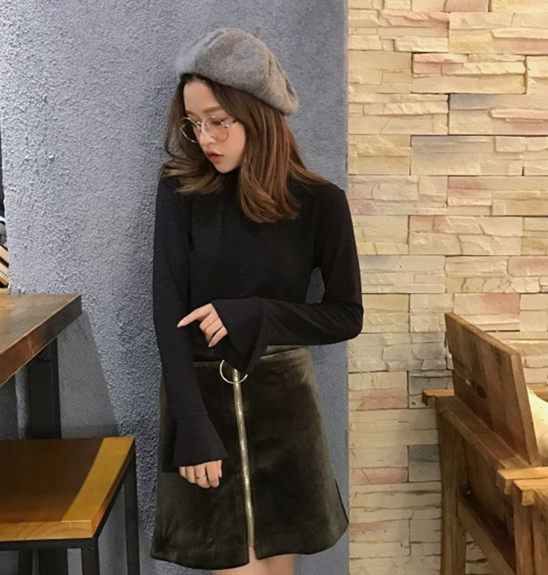 韓國chic秋冬款時尚亮絲圓領喇叭袖修身顯瘦套頭打底衫T恤女