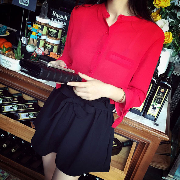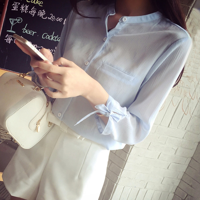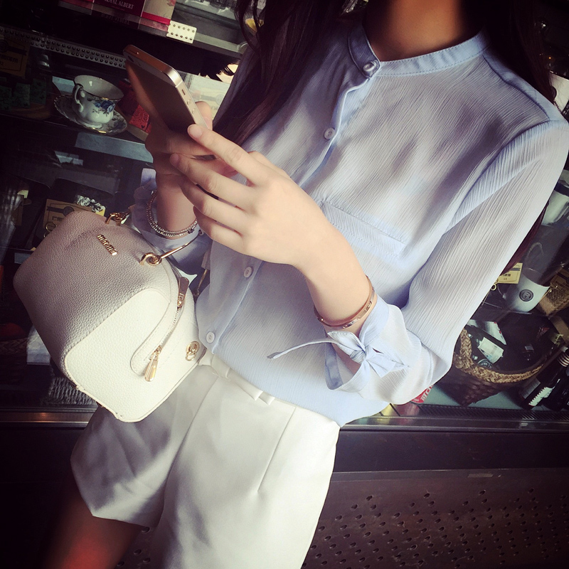 2017夏季新款韓版休閑上衣百搭白色襯衣七分袖立領雪紡襯衫女韓范