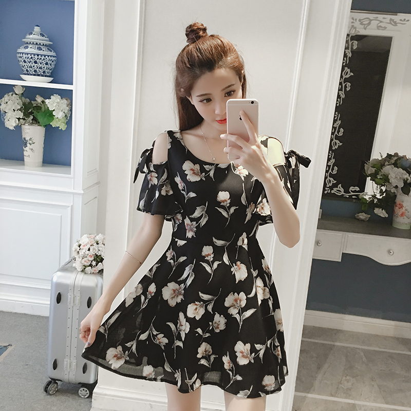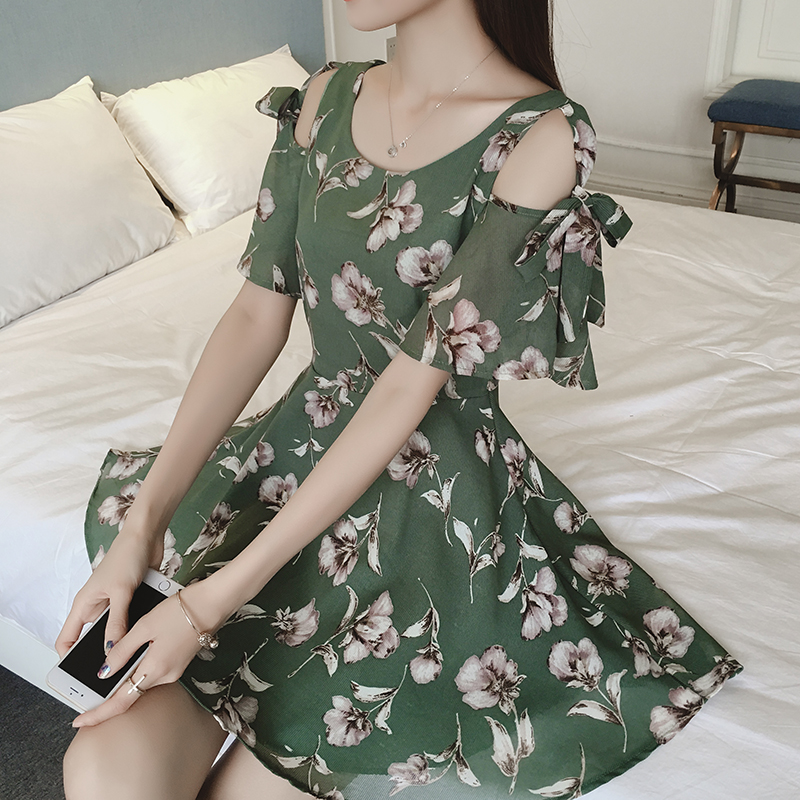 / 夏季新款女裝韓版荷葉袖短袖a字裙子修身碎花露肩雪紡連衣裙