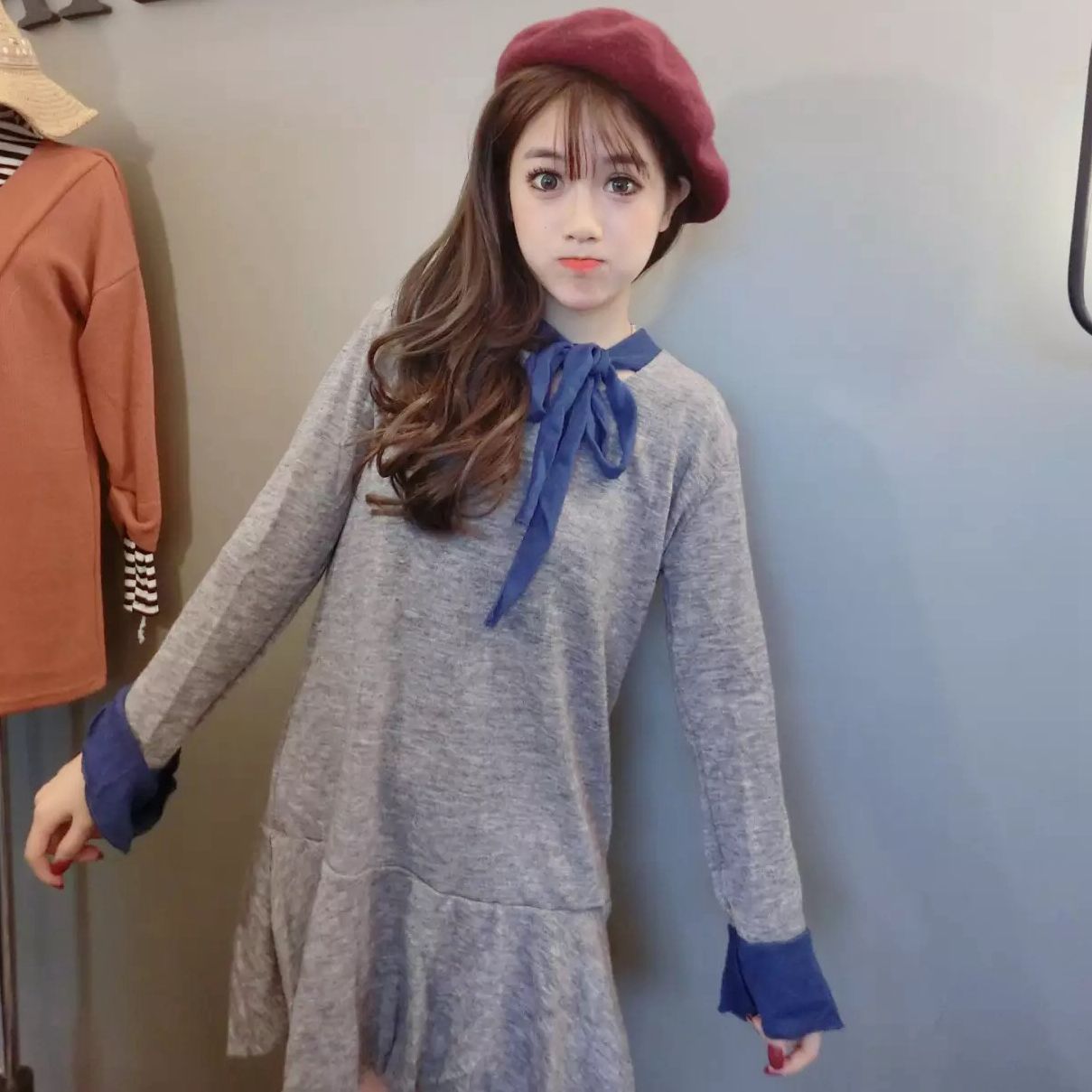 甜美連衣裙春秋款新款韓版學生系帶蝴蝶結長袖荷葉邊打底裙女
