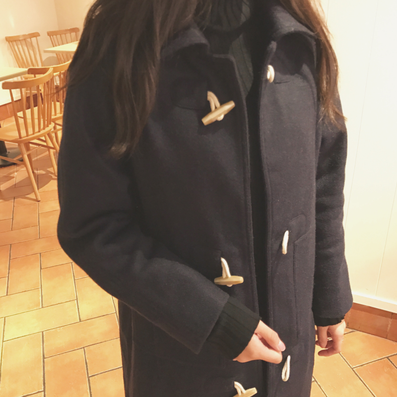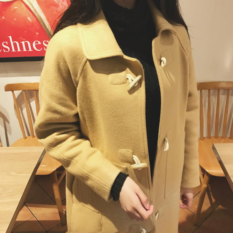 韓國chic秋冬款復古簡約牛角扣中長款夾棉加厚毛呢外套大衣女