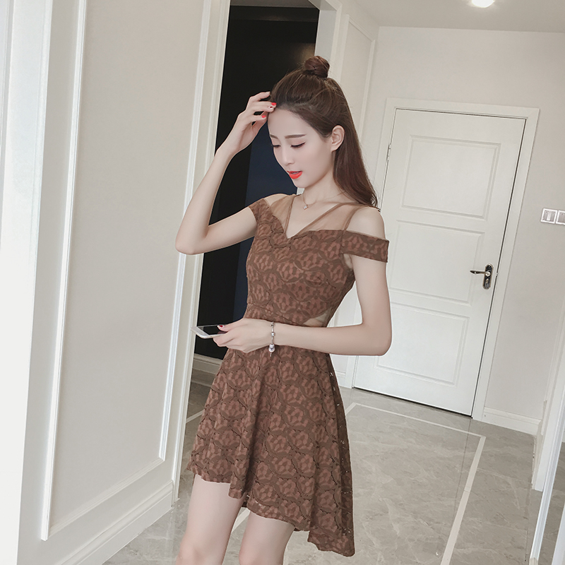 夏季新款性感露肩蕾絲拼接歐根紗裙子不規則收腰顯瘦連衣裙女