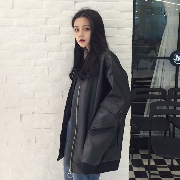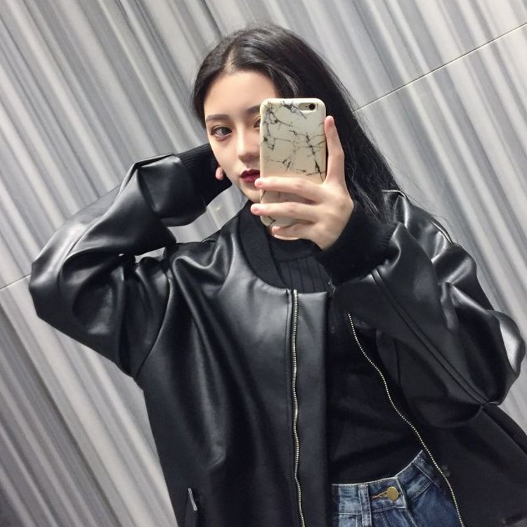 秋冬韓國復古百搭黑色加厚夾棉夾克圓環拉鏈寬松黑色PU皮衣女