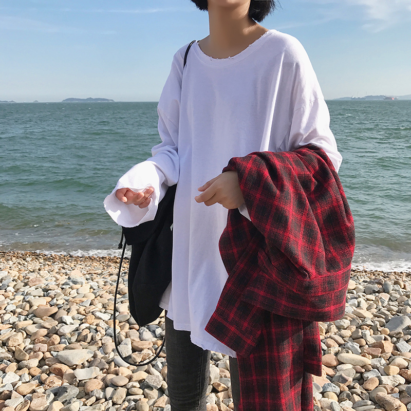A7seven 破洞寬松oversize白色長袖T恤女春秋韓版百搭圓領打底衫