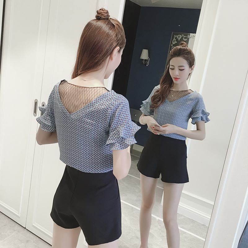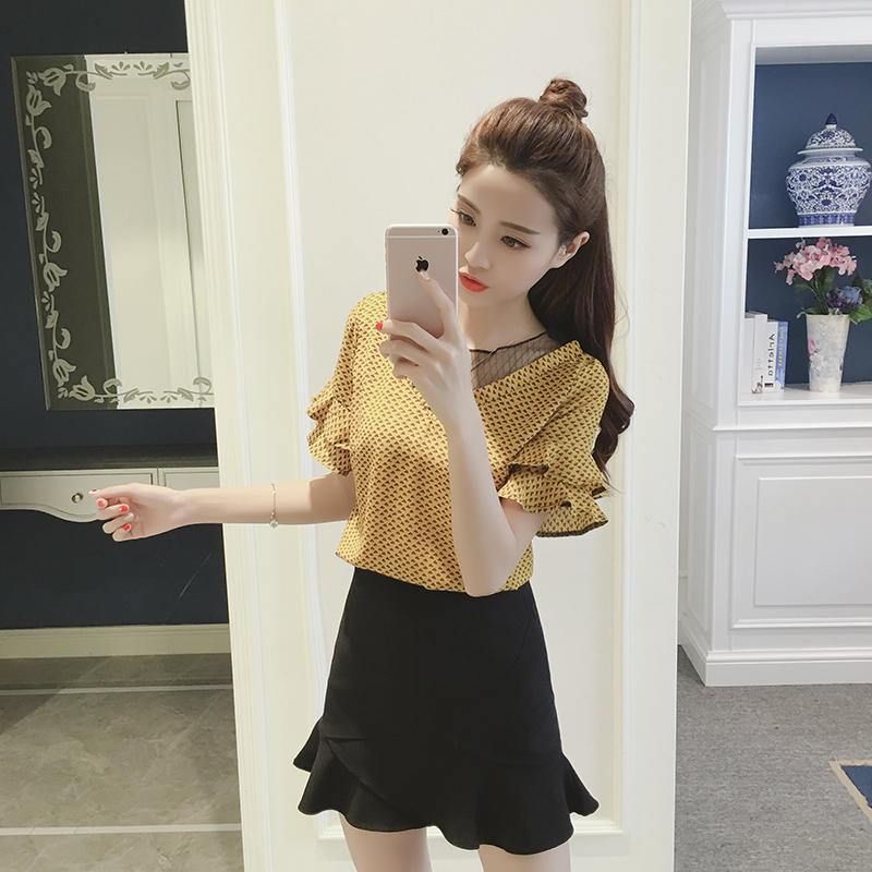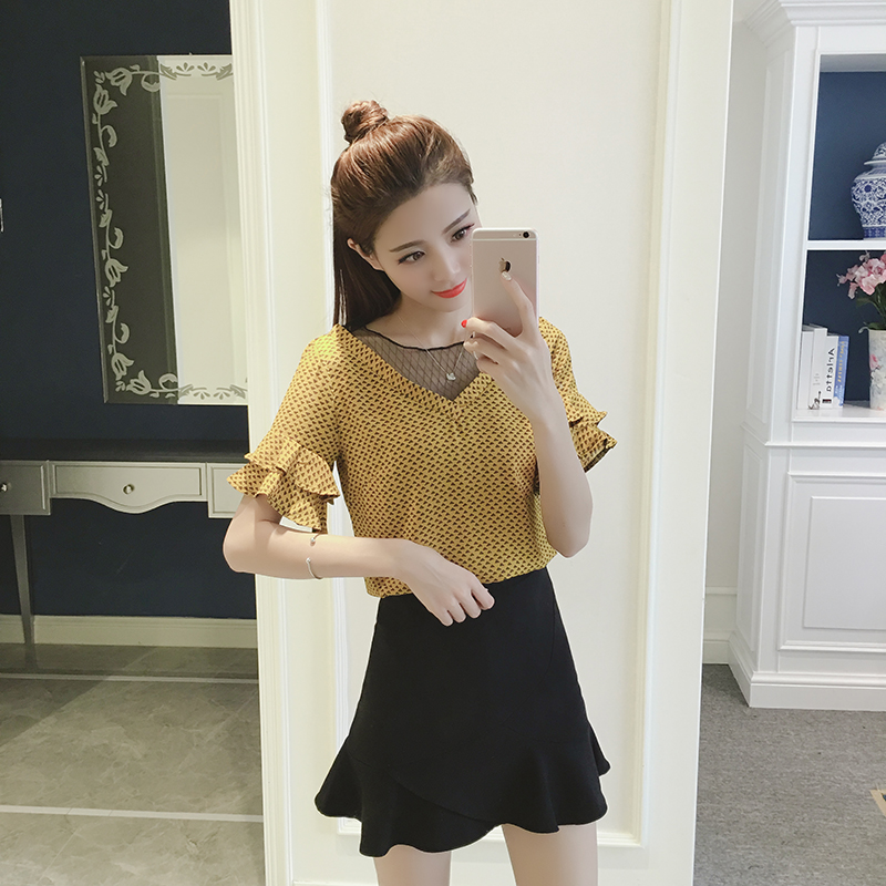 / 夏季新款荷葉邊袖花雪紡衫短袖女小衫韓版顯瘦網紗拼接上衣潮
