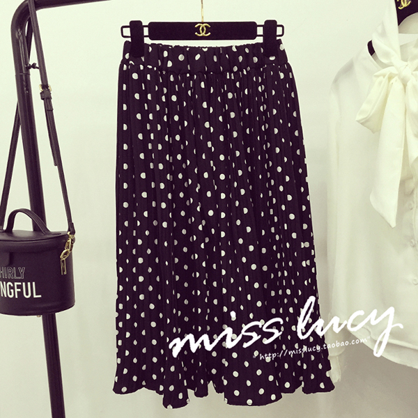/ 2017春裝新款女裝復古文藝波點高腰百搭松緊腰百褶裙半身裙中長裙