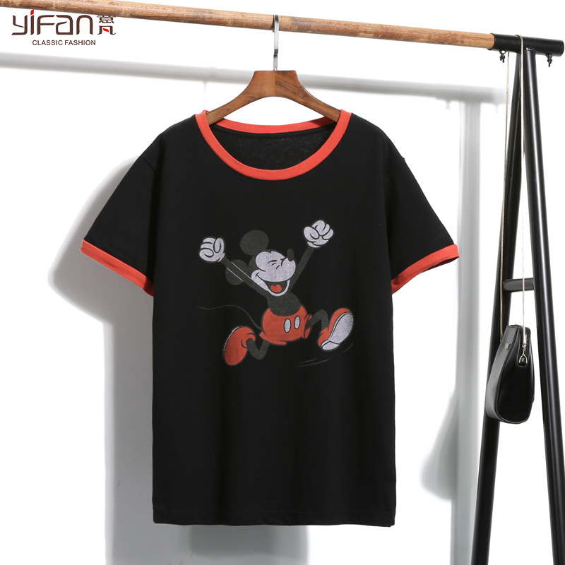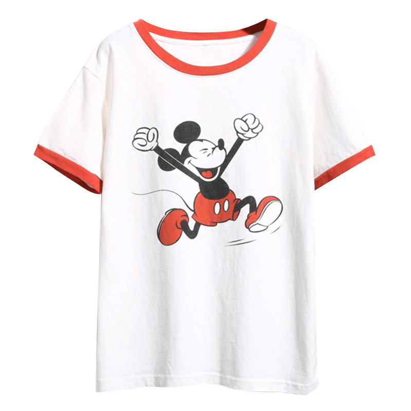 / 春夏新款卡通印花撞色袖T恤寬松套頭女裝短款短袖打底上衣