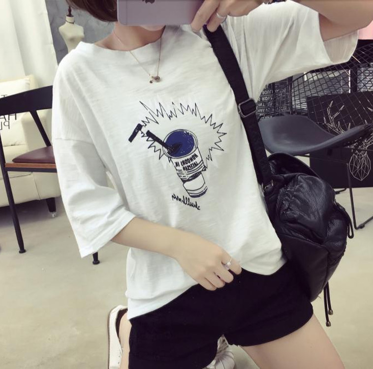/ 夏裝新款顯瘦學生t恤女圓領卡通印花竹節棉上衣短袖韓版體恤