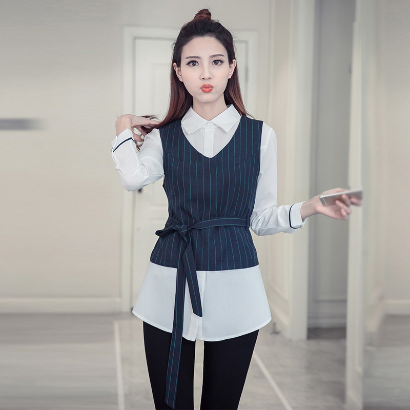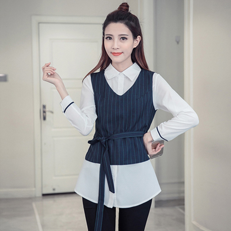 / 春裝新款馬甲襯衫兩件套女上衣時尚白色長袖襯衣中長款打底衫