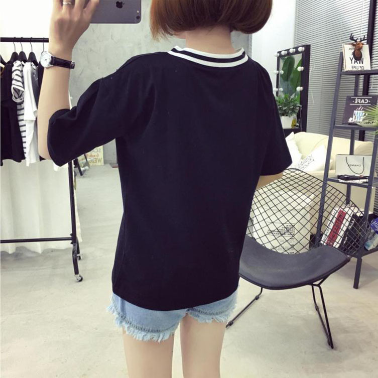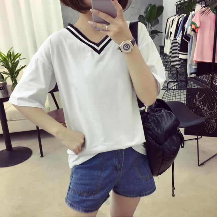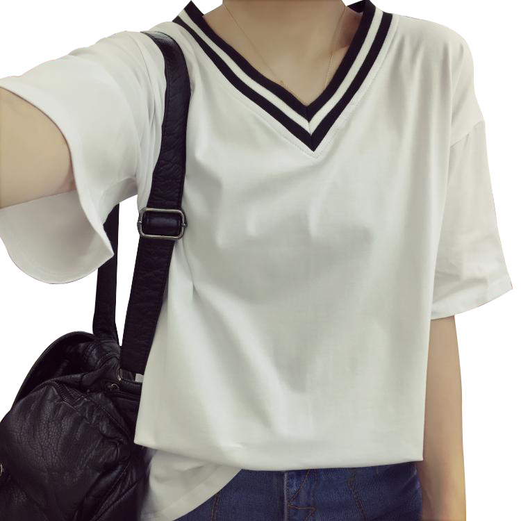/ 春夏韓版黑色V領女裝上衣寬松短袖t恤女新款學生簡約套頭T恤